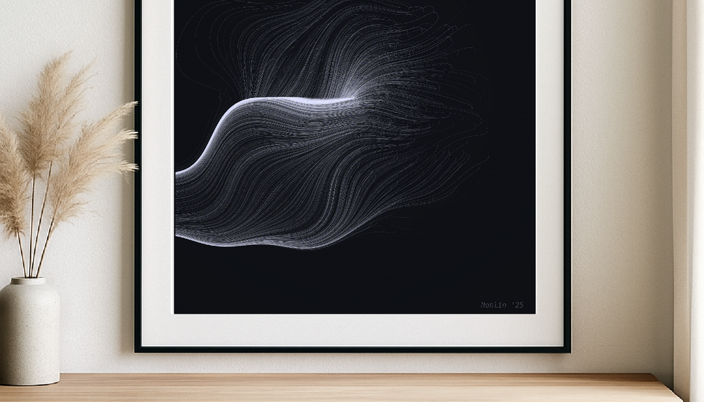 Each line in the composition is shaped by a flow-field system where motion, density and direction evolve naturally over time. Nothing is AI-generated. Every detail comes from code, mathematics, and deliberate artistic tuning.